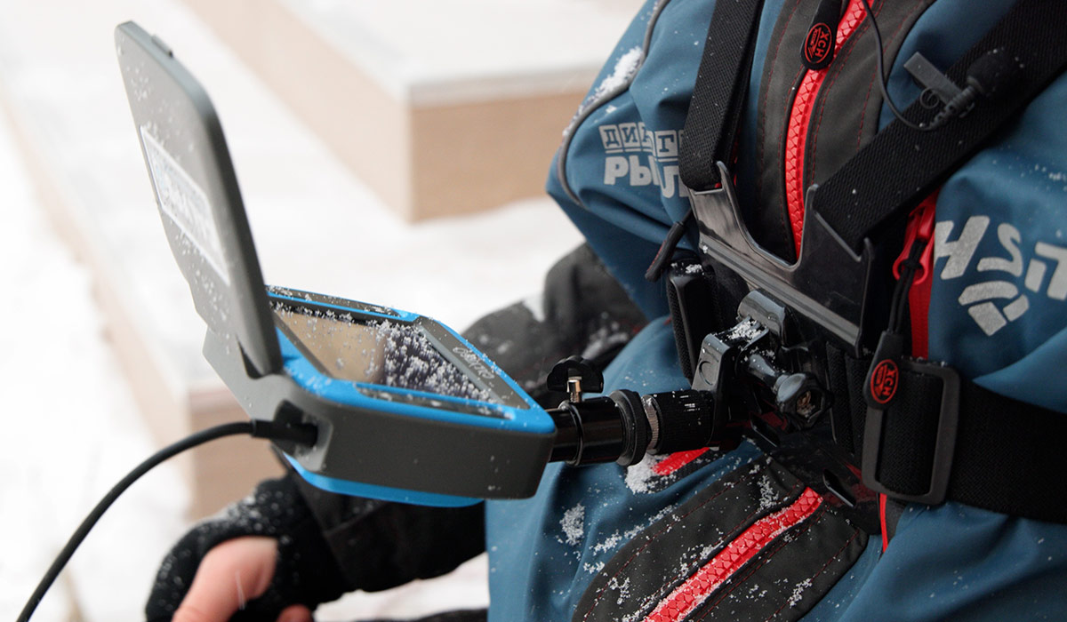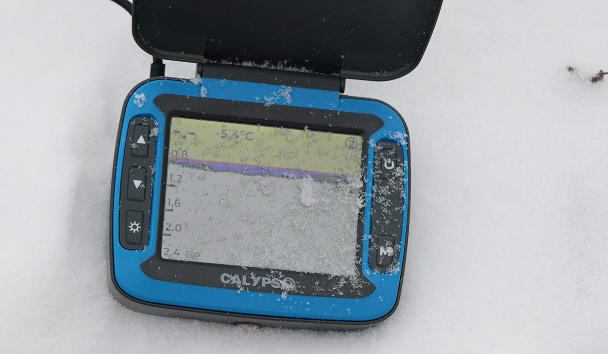 Положить эхолот рядом с лункой на лед. Но такой вариант не очень хорош из-за того, что эхолот будет припорашивать снегом и придется часто протирать экран.