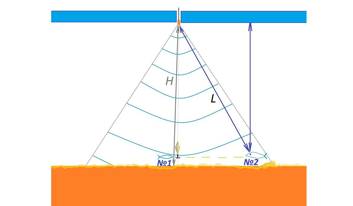 Здесь же считаю целесообразным напомнить, что из-за особенностей распространения звука от условно точечного источника, коим является датчик (распространение сигнала идет фронтом), эхолот показывает глубину только вертикально вниз. Если предмет удален от вертикали, тогда прибор покажет удаление от излучателя, а не реальную глубину.