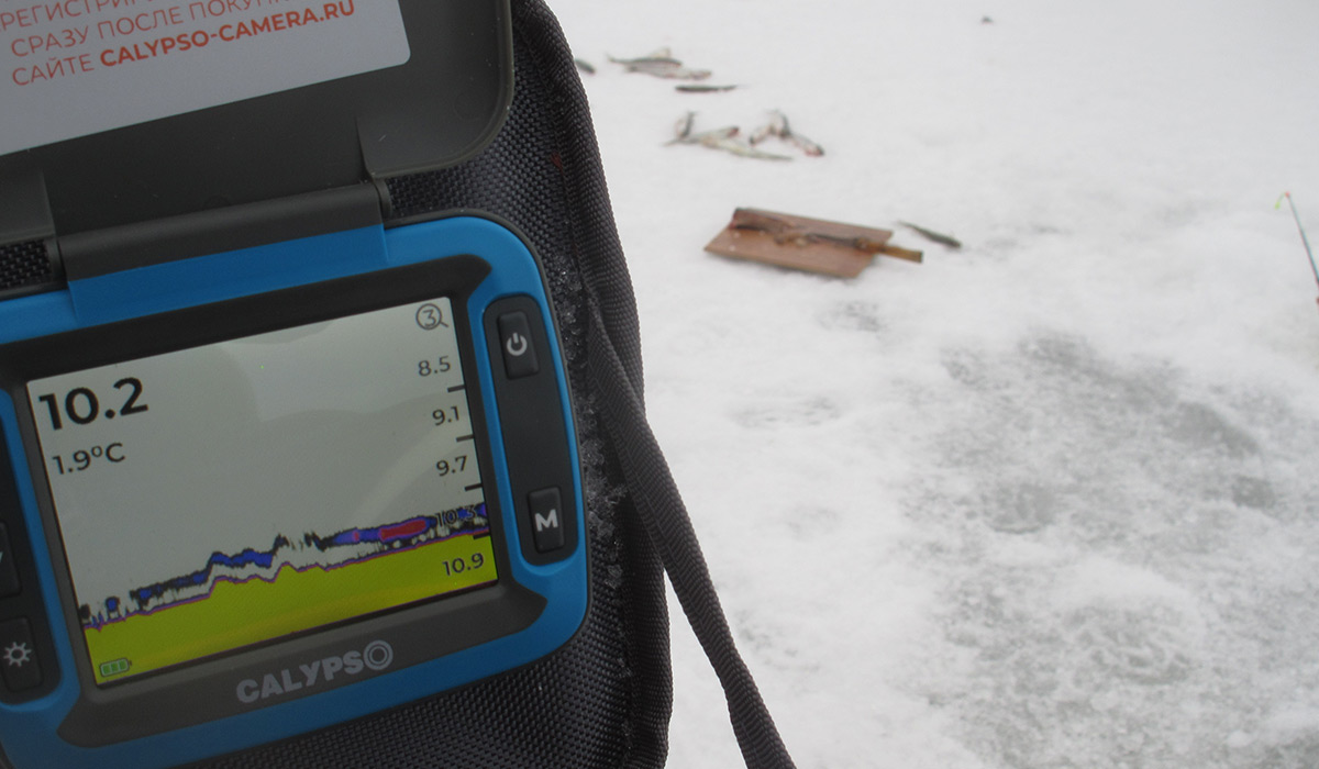 Иногда косяк рыбы поднимается несколько выше дна, и там у всех или у многих, наступает расстройство. Рыбы нет, печаль! Когда же в лунку опускается датчик эхолота, то картина значительно проясняется. Рыба, оказывается, есть, но выше или значительно выше мормышек. Значит, можно играть выше блесной или перевязать мормышки на удочках, что не очень удобно, особенно на морозе и на ветру.