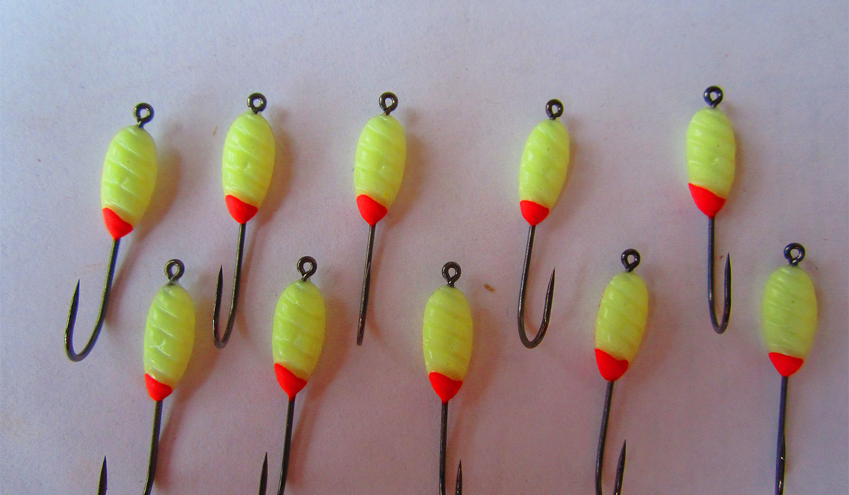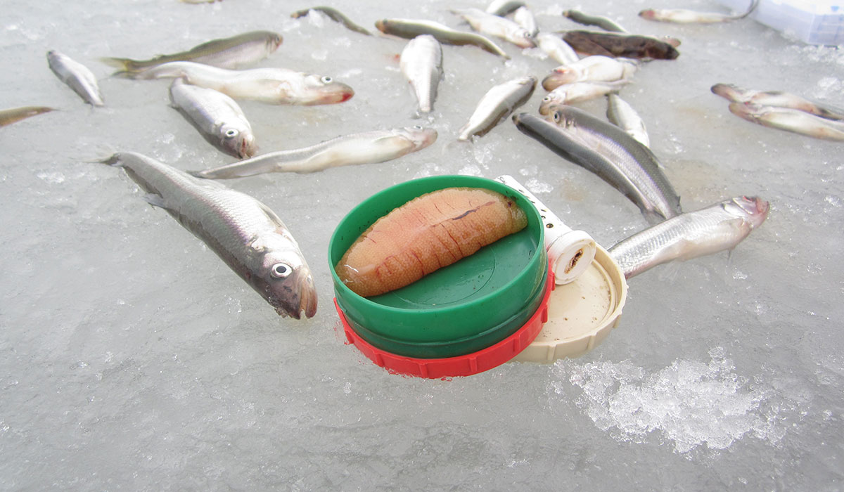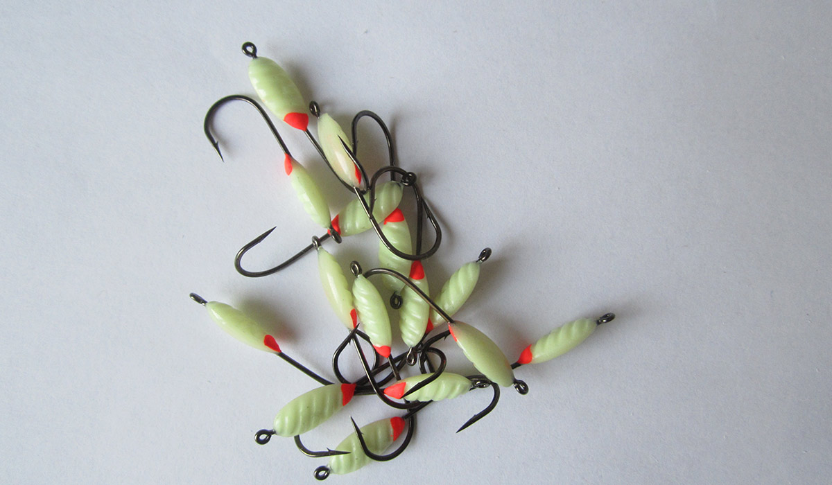 Если снасти на корюшку заметно менялись, хотя это принимают и поддерживают не все рыбаки, то приманки претерпели минимальные изменения. Это мормышки со светящимся телом разных цветов, форм и размеров. В качестве насадки используется мясо рыбы, в ход идет бельдюга, ерш, окунь и сама корюшка. Но в последние годы на первое место выходит карась.