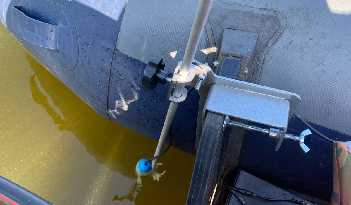 Правильно закрепите эхолот. Это можно сделать с помощью обычной струбцины. Датчик должен быть полностью погружен в воду вертикально.